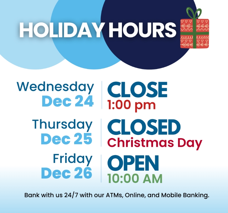 You can continue to bank with us 24/7 through Online and Mobile Banking, as well as at any of our ATMs.